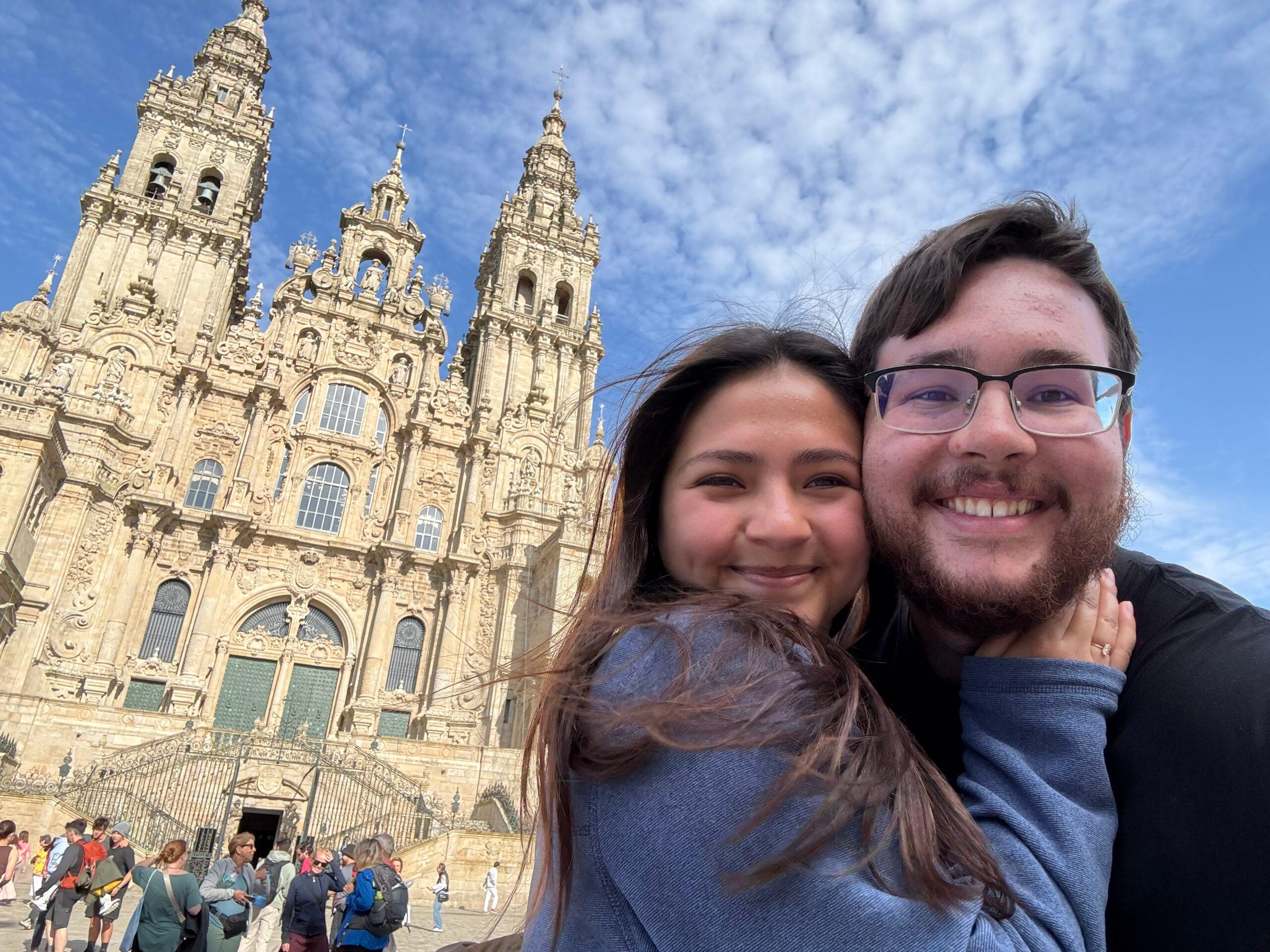 Two students posing in front of the Santiago de Compostela Cathedral in Spain on a sunny, spring day.